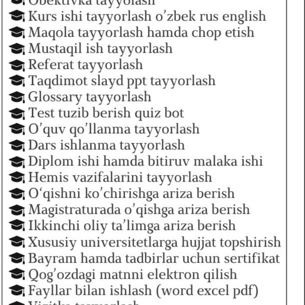 Kurs ishi tayyorlab beramiz Ingliz Rus O'zbek tilida o'qituvchi talabidek qilib beramiz.