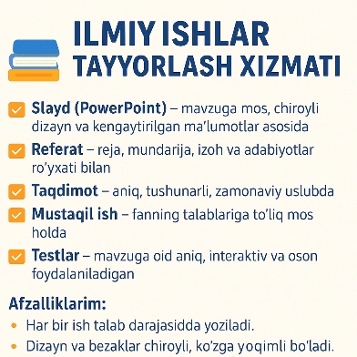 💡 Sizga kerak bo‘lgan slayd, referat, taqdimot, mustaqil ish yoki testlarni ishonchli va sifatli qilib tayyorlab beraman.