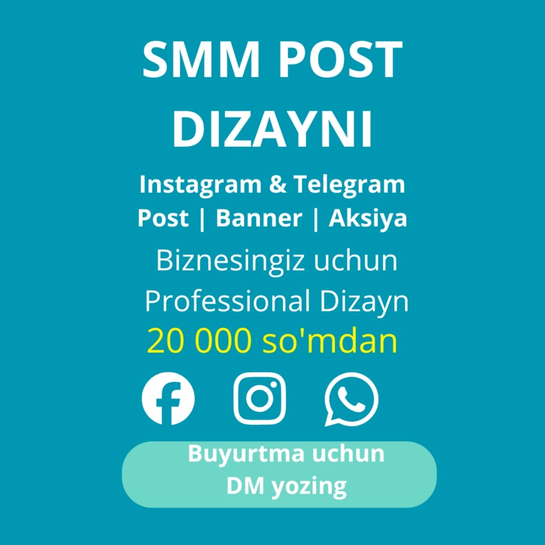 Men sizning biznesingiz uchun professional SMM post, banner va reklama dizaynlarini tayyorlab beraman.
